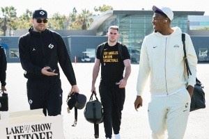 五连客!湖人众将登机造型:全员舒适出行 艾顿大粗项链带着累吗