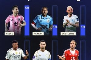 SofaScore数据库球员10分次数排名:梅西50次遥遥领先,C罗13次